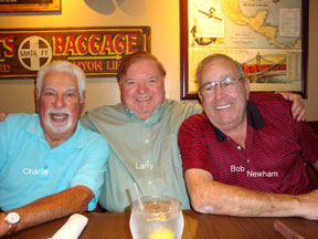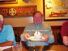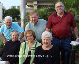 Happy Days are Here Again! Larry Oxley believes that life begins at 70 and he feels we should have many happy days ahead for the next 30 years. These photos show some other class of 59'ers who helped him celebrate at Longhorn's Restaurant in Altamonte Springs on Monday night, the 14th of March. This group usually meets once a month for dinner and this was a special celebration of one of our classmates. Wish more of you could have joined the party. Pictures above include birthday boy Larry, Suzanne Scott, Bob & Brenda Blocker (c/'59) Newham, Helen Merritt (c/'59) Bryan and Charlie Faro.